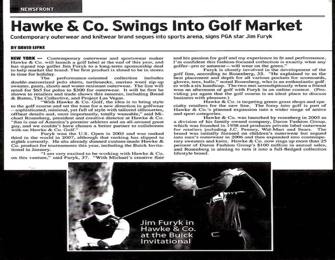 Hawke & Co signed an exclusive 7-year contract with PGA professional Jim Furyk, then ranked #2 in the world. Furyk, a US Open winner with 29 professional wins and the lowest recorded score on tour of 58 became the face of Hawke & Co golf.